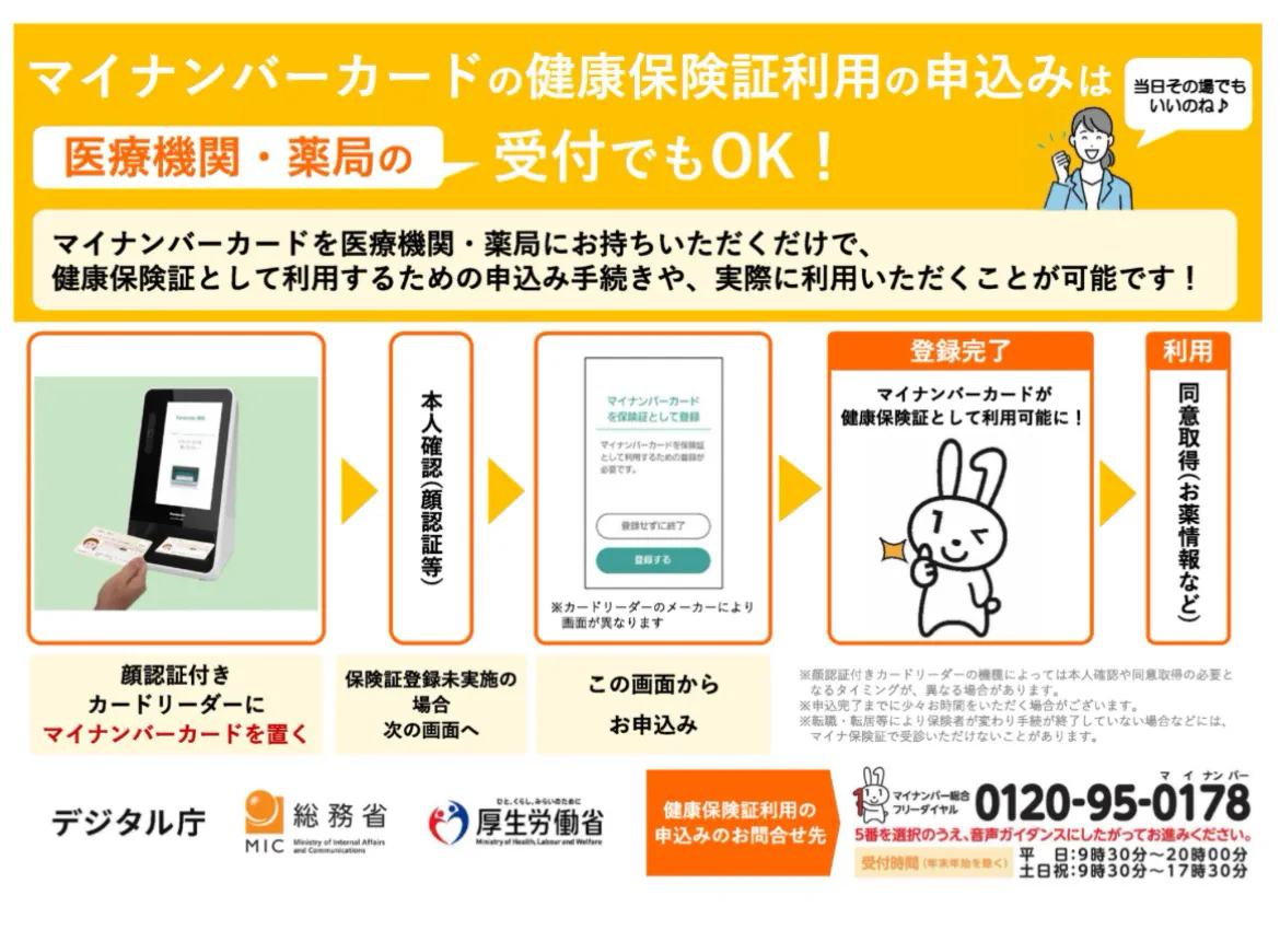 ※マイナンバーカードの健康保険証利用の申込みは、『当院の顔認証付きカードリーダー』で行うことができますので、安心してご利用ください。