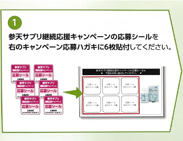 ①商品に付いている応募シールを6枚集めて、応募ハガキに貼り付ける。