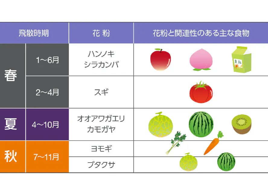 花粉-食物アレルギー症候群:PFAS(pollen-food allergy syndrome)といい、花粉症の人の中には、その花粉のアレルゲンと似た性質をもつ生の果物や野菜を摂取した際に、口の中がかゆくなったりのどがイガイガして腫れたり息苦しくなったりする人がいます。花粉症の種類によって関連性のある食物は異なります。