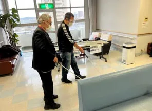 今回も白杖の歩行体験コーナーも行われていました。折りたたみ式や、下にコロコロが付いて動かしやすいもの、重さも様々でした。山口県盲人福祉協会の歩行訓練士の福田さんが丁寧にアドバイスしてくださいました。