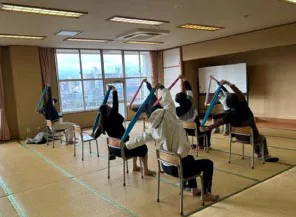 今回初の試みとして、身体を整える簡単体操のコーナーを設けました。トレーナーの方に自宅でもできる身体の動かし方を教えていただきました。おしゃべりも交えながら皆さんが笑顔で身体を動かしていました。