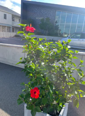 院の駐車場から玄関までの通路にあるハイビスカスが咲き始めました!ご近所の動物病院の佐々木先生に苗木をいただいたものです。7月に入ってから、真っ赤でとてもきれいに咲いています。
