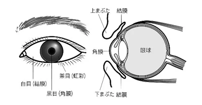 目の表面を覆う薄い透明な粘膜で、黒目(角膜)のまわりの白目の表面と、瞼の裏をおおうピンクの部分からなっています。目の表面の粘膜には、目に入ってきた異物や病原体が目の中に侵入するのを防ぐはたらきがあります。