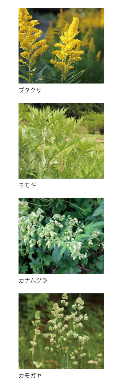 キク科のブタクサやヨモギ。アサ科のカナムグラ、イネ科のカモガヤ。これらの草が開花期を迎える9~11月に花粉が飛散し、花粉症を引き起こします。
