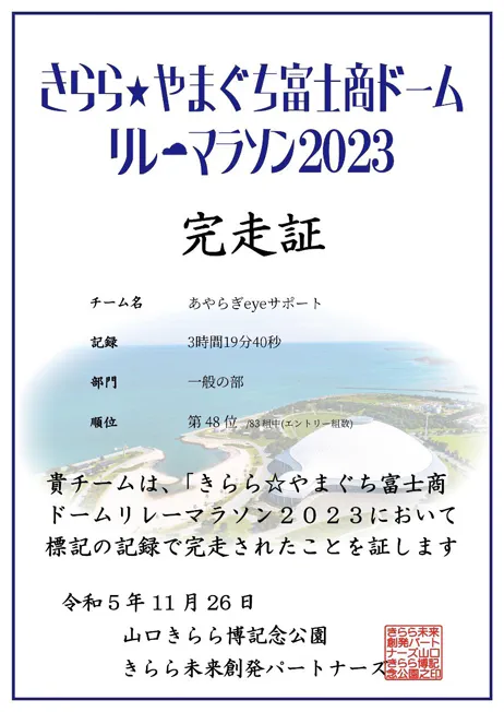 11月26日に山口市で開催されたきららリレーマラソンにあやらぎeyeサポートチームが出場しました。