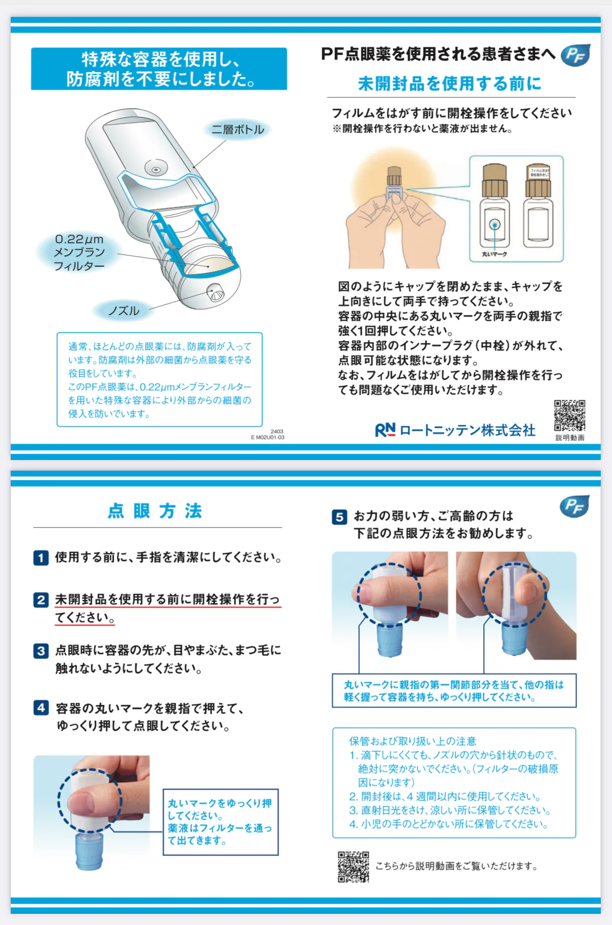 PF点眼薬は、特殊なフィルターを使用した容器に入っており、通常の点眼薬より少し大きめです。使用前に開栓操作をしないと薬液が出ない仕組みになっているため、必ず薬局で薬剤師から説明を受けてから使用しましょう。