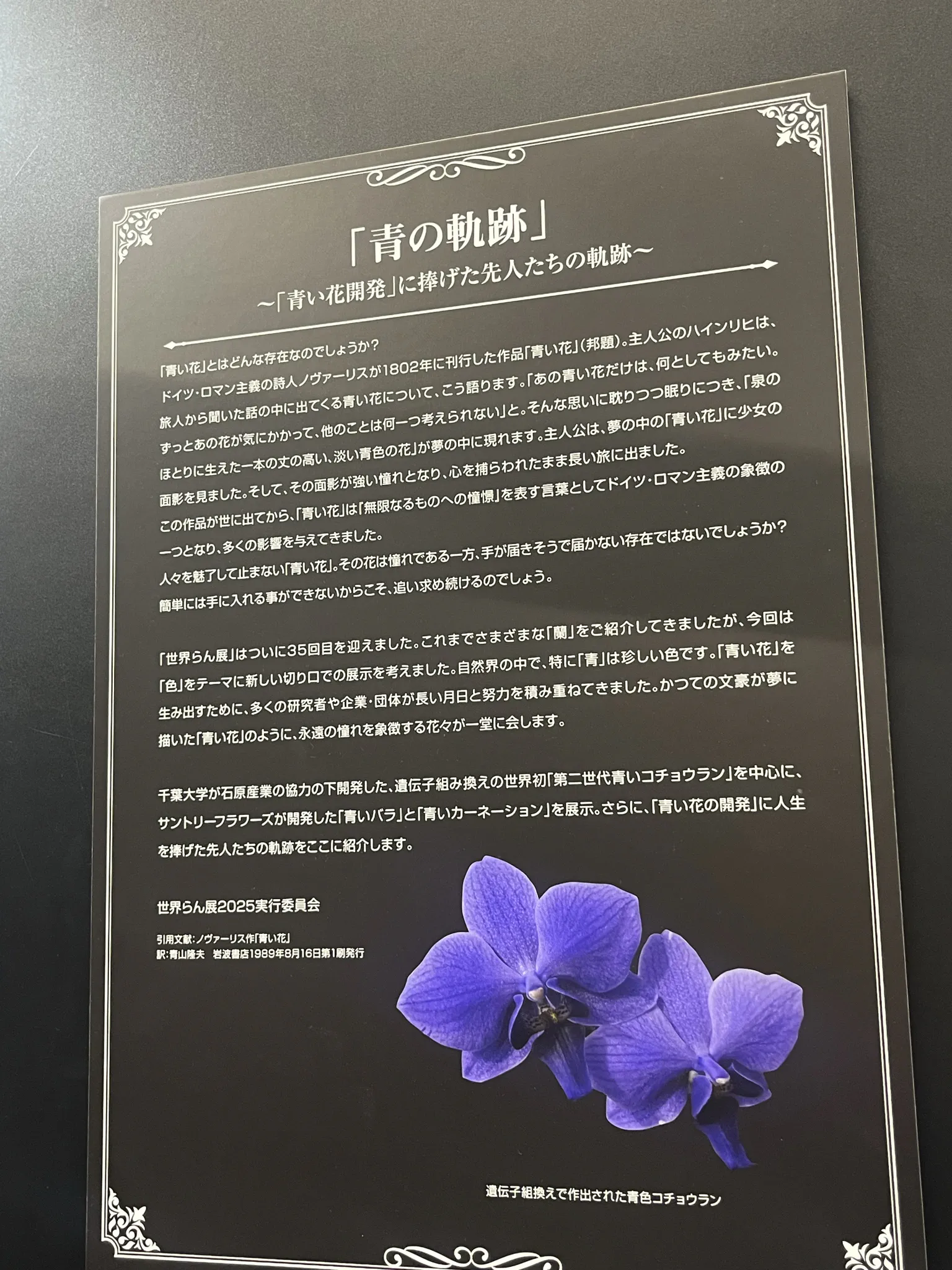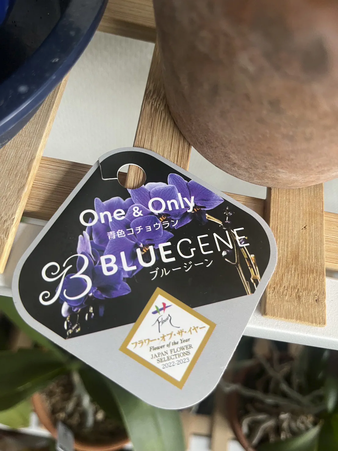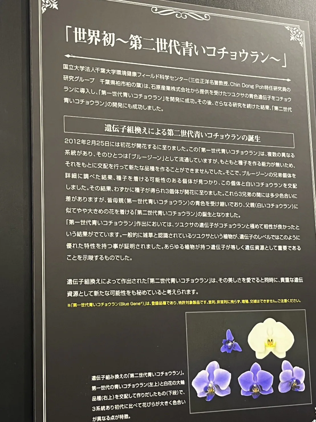 「青の軌跡」と呼ばれる、千葉大学が遺伝子組み換えにより世界ではじめて開発に成功し作出された「第二世代青いコチョウラン」です。