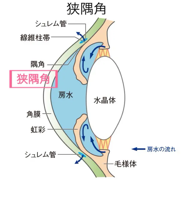 眼の中にある“隅角”という部分が“狭く”なっている状態を指します。