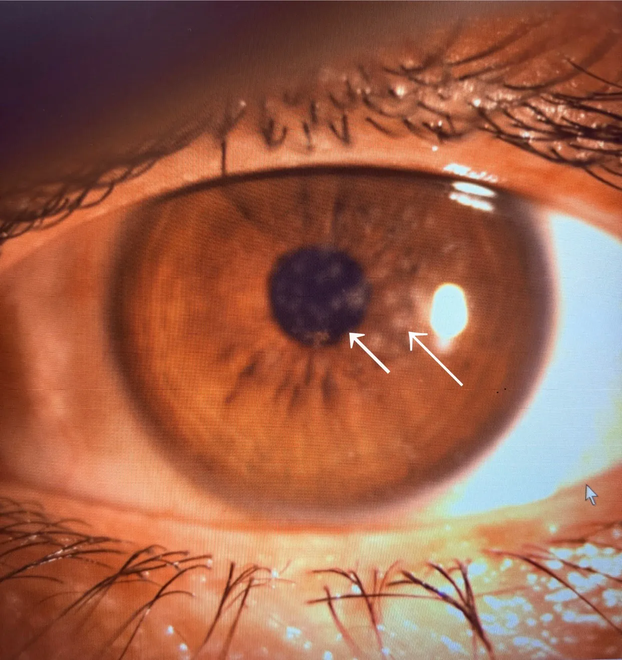 ・黒目の濁り(角膜混濁):治りかけの頃に角膜に点状の濁りが出て、霞み・視力低下を起こすことがあります。多くは自然に消えますが、視力障害が残る場合もあります。