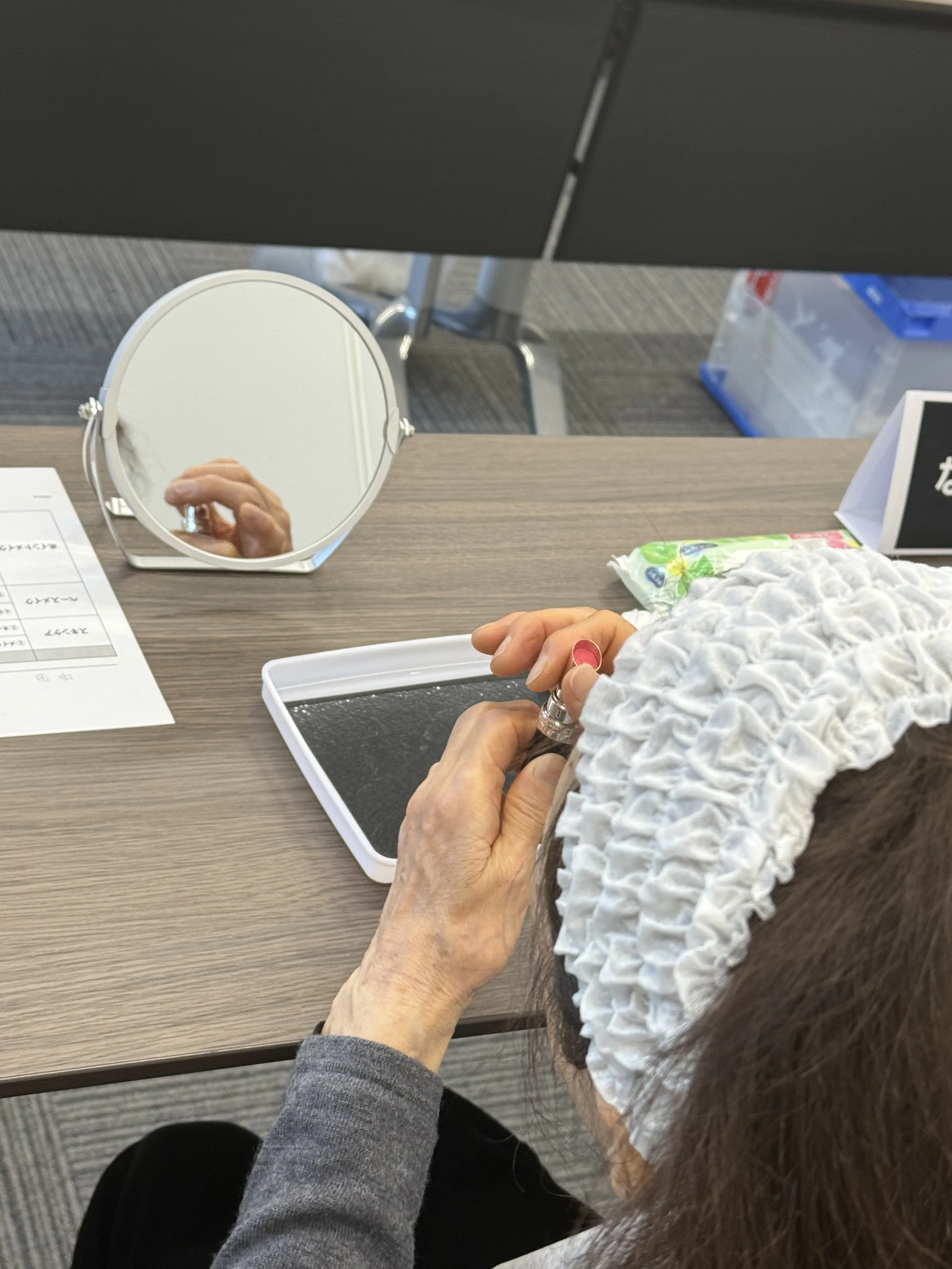 最初は顔の部位確認から始まり、目頭・目尻・小鼻・口角などを、言葉と手指で細かく確認していきます。すぐに化粧品を使うのではなく、まず手指を動かす練習を行い、コツをつかんでから実践するため、終始和やかな雰囲気でした。
