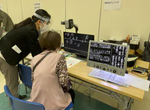 拡大読書器を実際に体験しています。