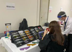 遮光眼鏡の体験です。これは単なるサングラスではなく、眩しい波長をカットしてコントラストをあげて見えやすくします。たくさんの色や種類があり、かけ比べたり用途に合わせて選択してくださったり丁寧に説明していただきました。