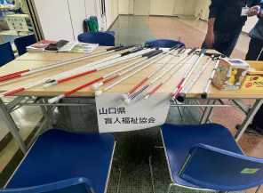 折りたたみ式や、下にコロコロが付いて動かしやすいもの、重さも様々でした。山口県盲人福祉協会の2名の歩行訓練士さんが丁寧にアドバイスしてくださいました。