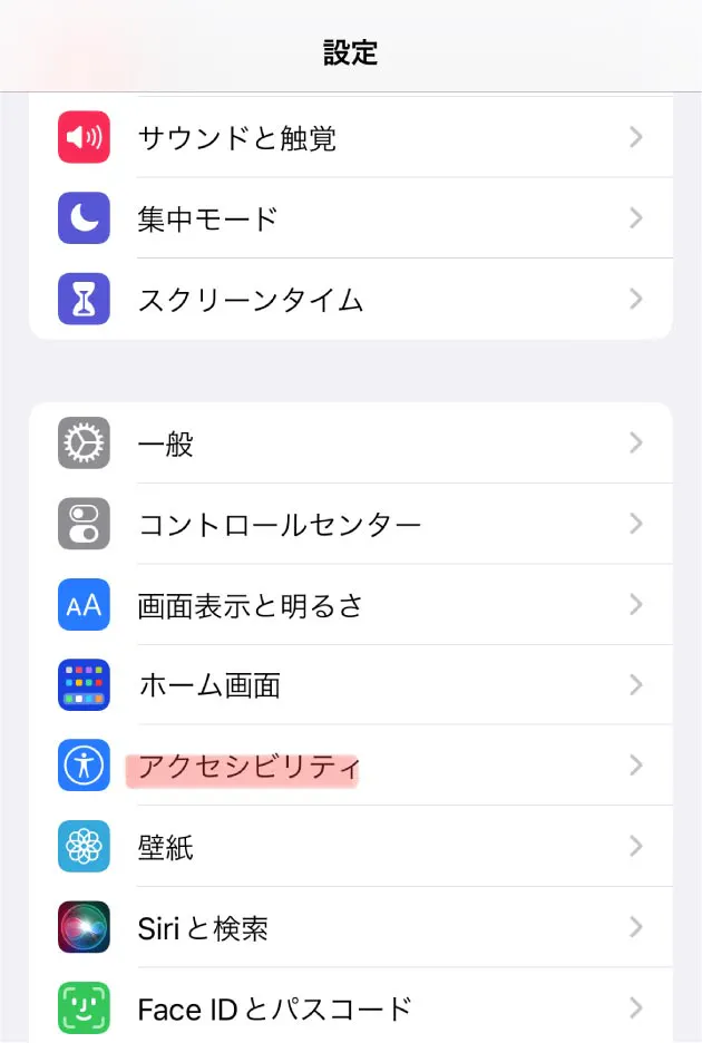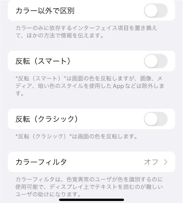 こちらはiPhoneの設定画面です。設定の一覧に“アクセシビリティ”があり、その中に“視覚サポート”の項目が並んでいます。