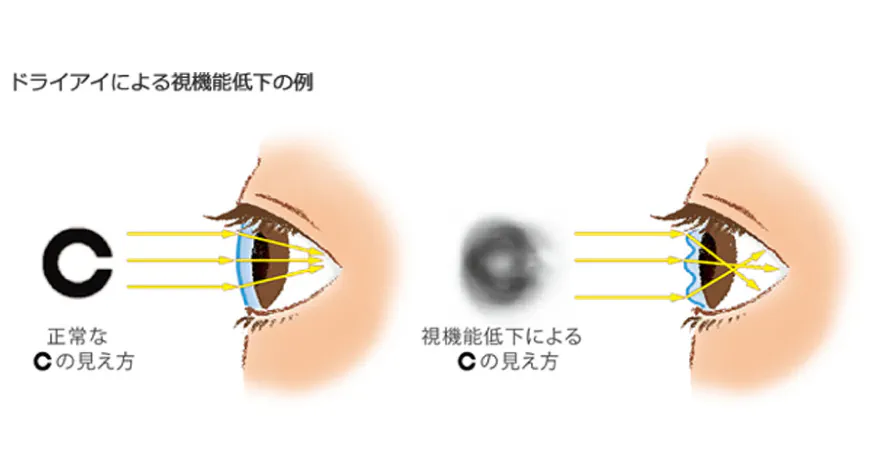 また、「乾く」や「疲れる」だけでなく、視力が良くても「ものがかすんで見える」など、見え方に影響がでる場合があります。
