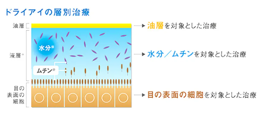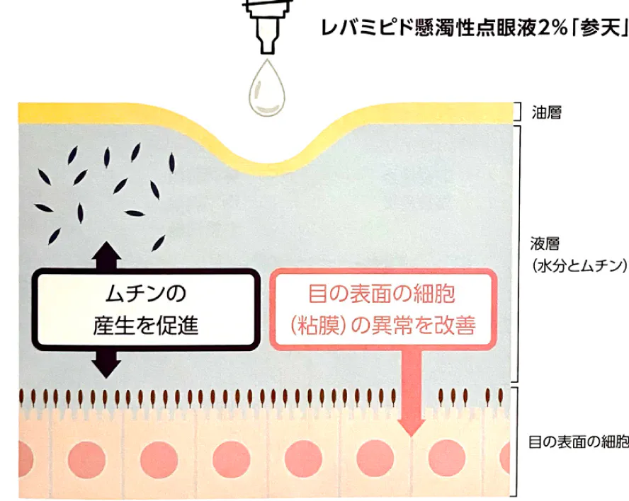 症状が軽い場合は、人工涙液やヒアルロン酸製剤などの潤いを持たせる点眼液で緩和させることができますが、水分やムチンが少ない場合は、ムチンや水分の分泌を促進する点眼液(ジクアホソルナトリウム)や、ムチンの産生や発現を促進する点眼液(レパミピド)が効果的です。