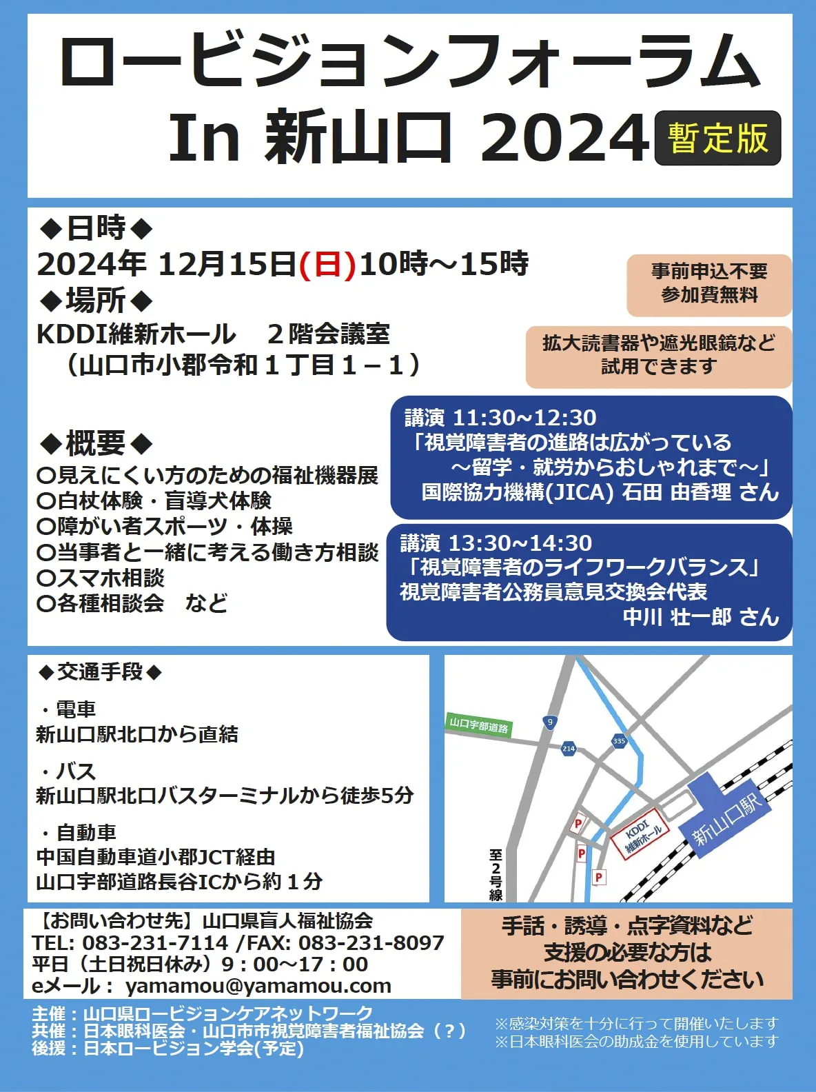 令和6年12月15日に開催される「ロービジョンフォーラムin新山口2024」の詳細が決定いたしましたのでご案内です。