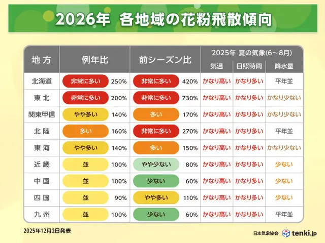 一般的に、飛散量が多かった翌年は雄花の形成が抑えられるため、2026年春の花粉飛散量は、西日本の広い範囲で減少すると予測されています。
