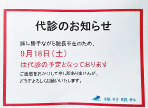 誠に勝手ながら院長不在のため、9月18日(土)は代診の予定となっております。ご迷惑をおかけして申し訳申し訳ございませんが…